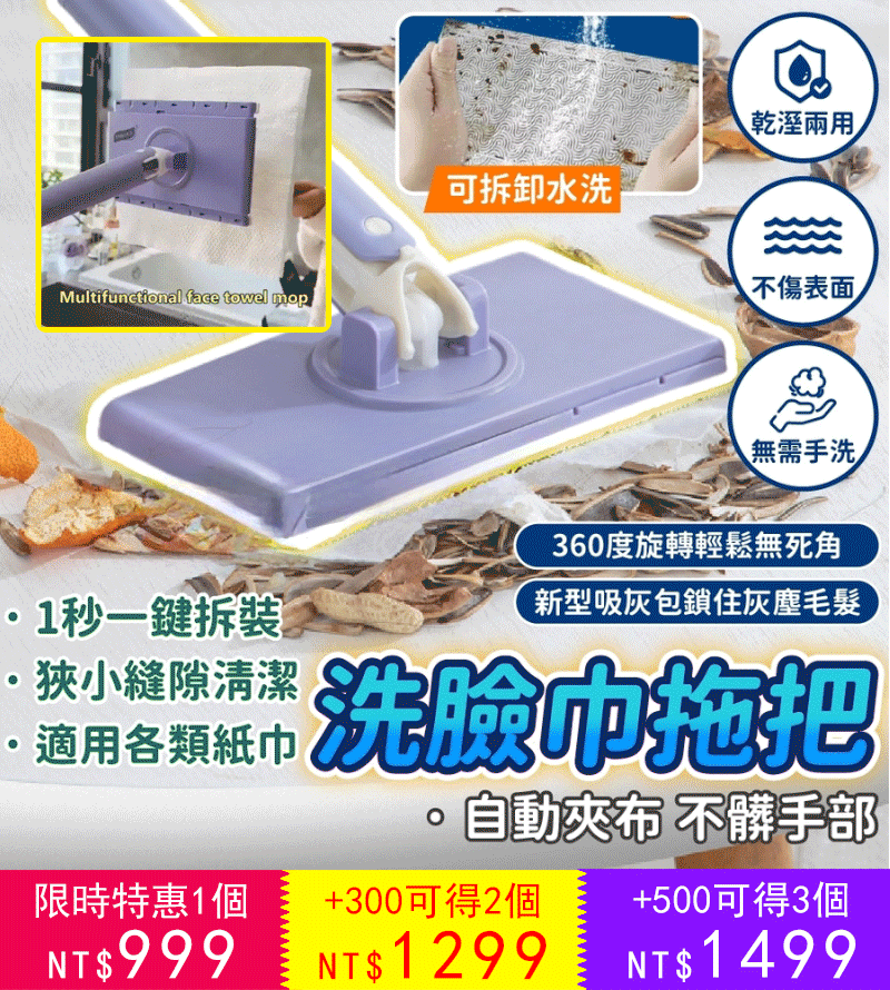 2分鐘前【2024設計獎得獎上新】免手洗懒人伸縮拖把,新升級設計,不在擔心拖把不好弄,新升級長度設計,同時不沾手放人工擰拖把,使打掃變得簡單 - 【今日限定 買三送三 6把+ 拖布*6包 】-NT$1499